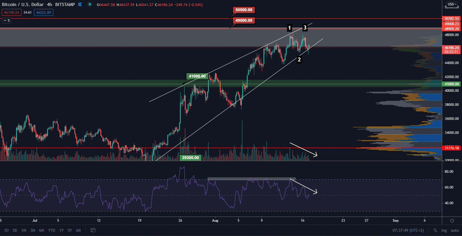 Bitcoin dosiahol dvojitý krátkodobý vrchol na hladine cca 48 000 $. Po druhom maxime cena spadla na supportnú zónu rastúceho klínu. Zároveň trhová cena stále neprekonala posledné minimum v bode 2. Pattern 123 top formation tak zatiaľ nebol potvrdený. Jeho potvrdenie tak nastane v prípade, že cena neudrží bod 2 a následne budeme hľadať nové minimum v korekčnom legu.