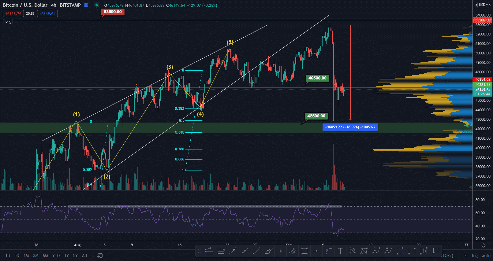 Hladina 41 000 $ oddeľuje predošlú akumulačnú zónu od rastúceho trendu. Ak by cena neudržala tento support, je možné, že na ďalší rast by sme si počkali o čosi dlhšie. Z krátkodobého hľadiska je cena na point of control, ktorý je na hladine 46 400 $, avšak reverzia trendu nie je potvrdená.