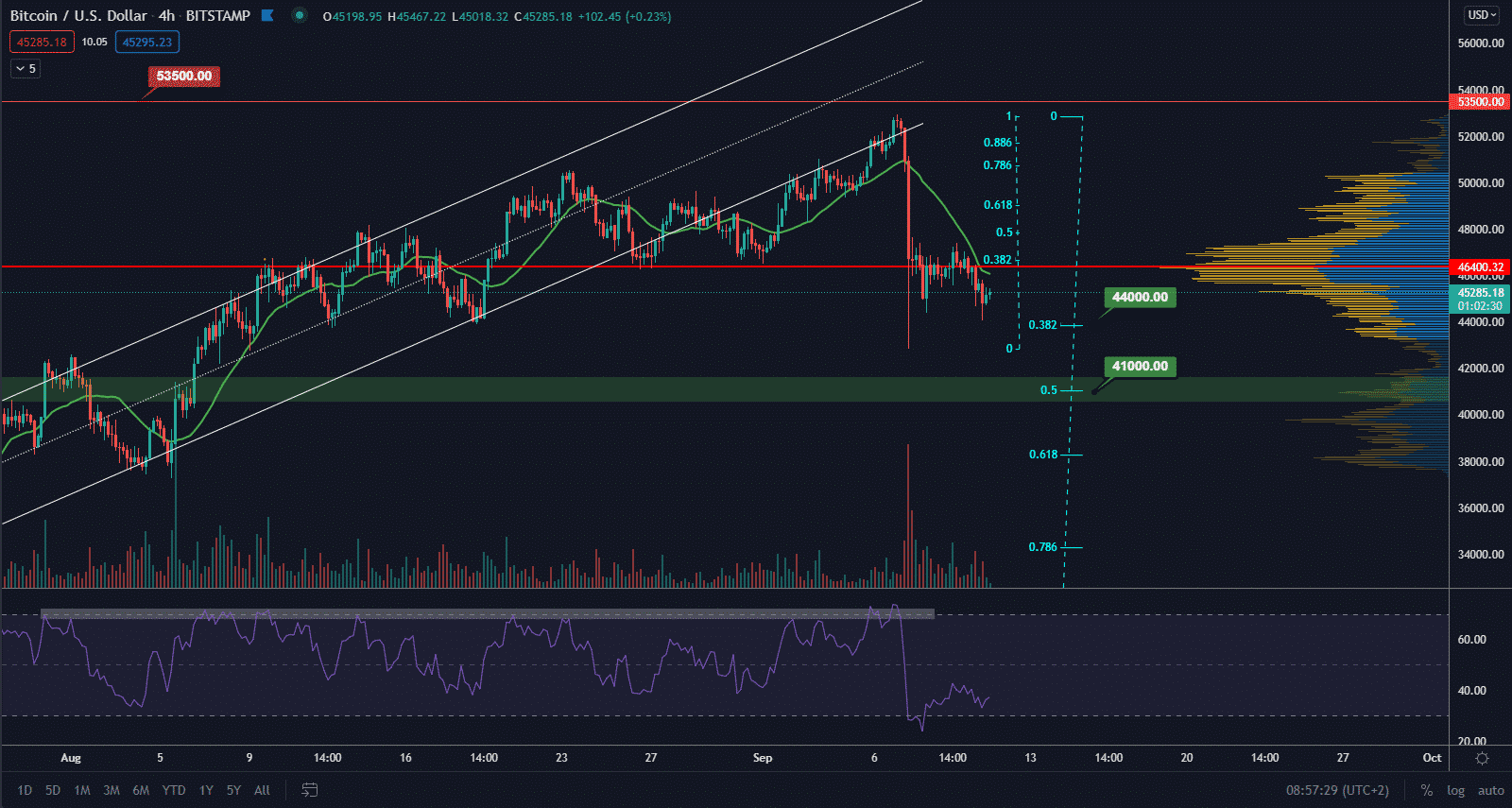 Hladina 44 000 $ je 38,2 % retracementu z celého rastúceho trendu od 29 000 $ po 53 000 $. Následne budeme sledovať support na hladine 50 % retracementu 41 000 $. Hladina 41 000 $ rozdeľuje predošlú akumulačnú zónu od rastúceho trendu. MA21 na týždennej perióde je 42 320 $, a teda hlavná supportná zóna sa nachádza medzi 41 000 $ a touto MA21.