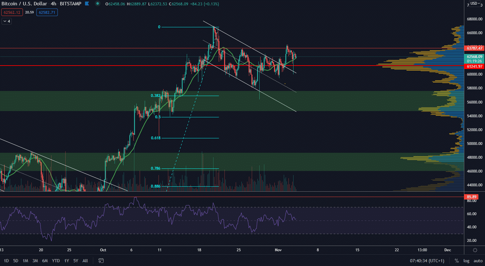 Krátkodobé minimá aj maximá rastú a objemy sú taktiež na strane býkov. RSI sa nachádza v neutrálnej zóne, čo znamená priestor aj na krátkodobý rast. Najbližší support sa nachádza na point of control, ktorý sme si spomínali a najbližšia rezistencia sa nachádza zhruba na 64 000 $.