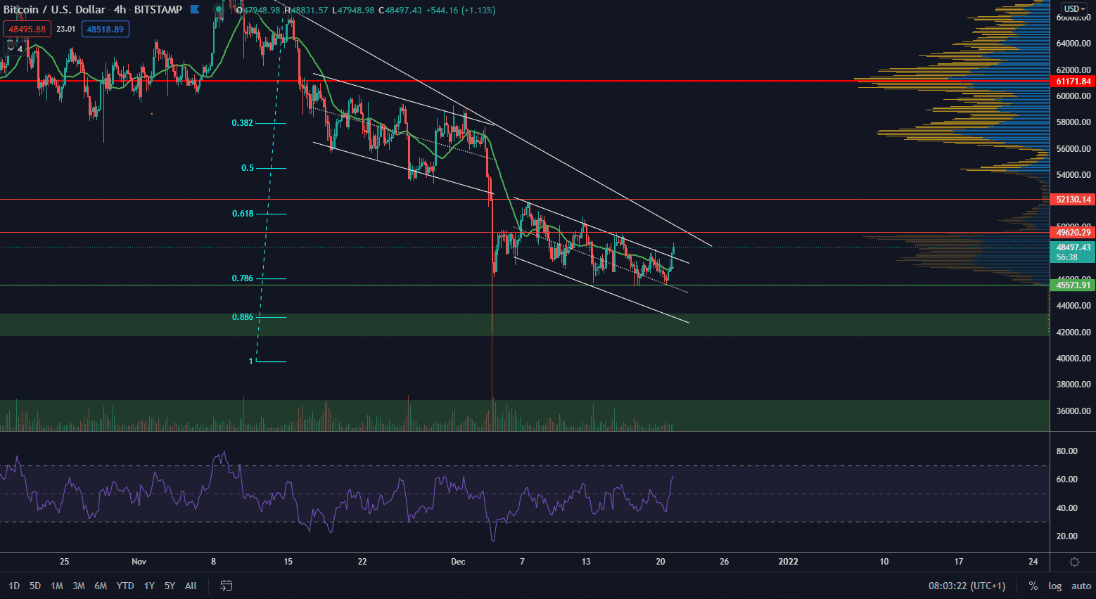 Bitcoin čelí rezistencii na hladine cca 49 600 $. Táto zóna predstavuje jednak predošlé maximum, ale aj rezistentnú líniu z maxím korekcie, ktorá platí od ATH. Prekonanie tejto rezistencie by znamenalo, že korekčný leg je na konci a nastupuje buď akumulačná zóna, alebo rastúci trend.