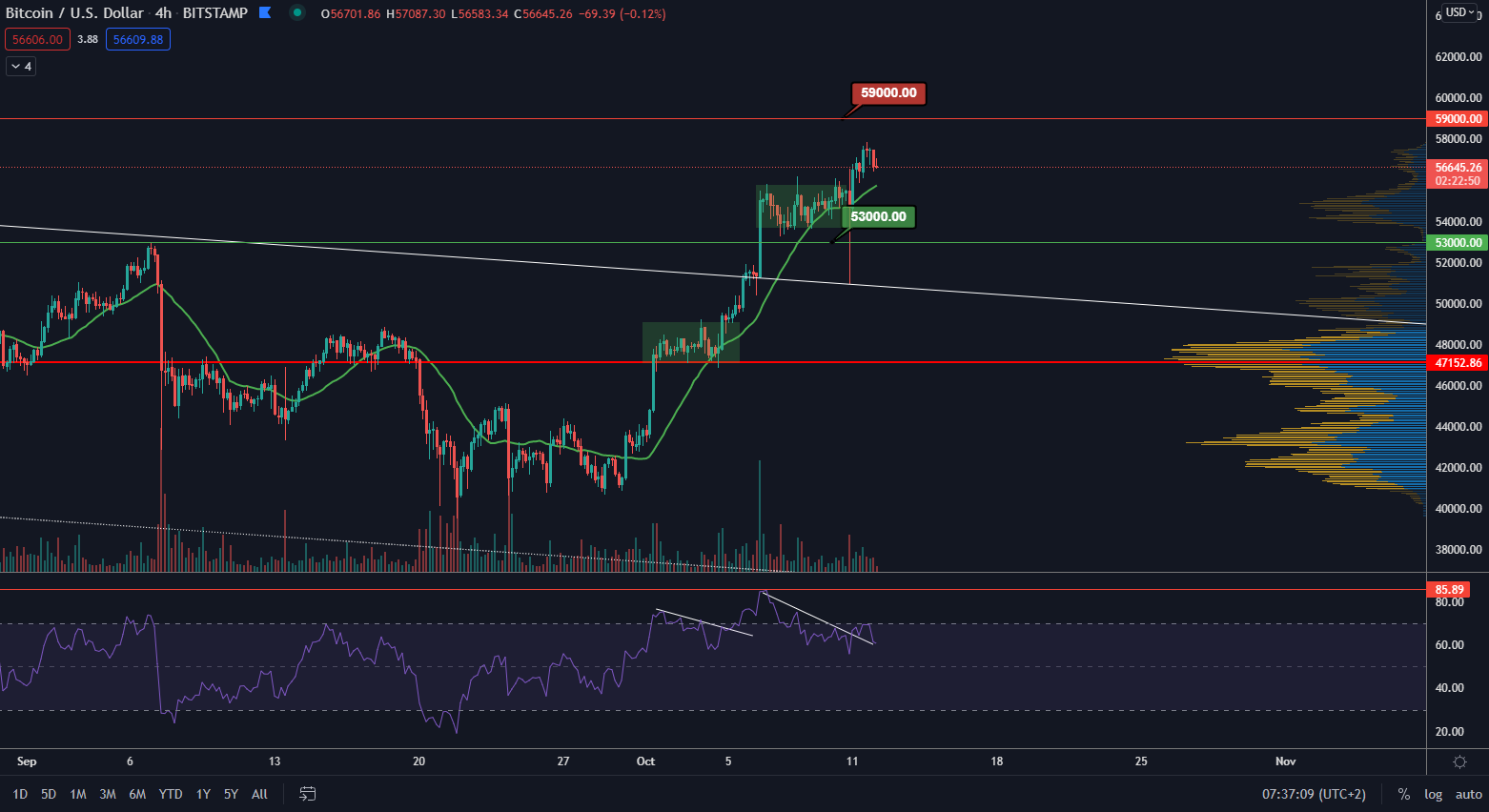 RSI z krátkodobého hľadiska prerazilo negatívnu divergenciu a vytvorilo vyššie lokálne maximum. Podľa RSI je teda ešte priestor na ďalší rast. Target, ktorý sledujeme posledné 3 dni, je stále na hladine 59 000 $. Táto hodnota predstavuje predošlé maximum, ktoré vzniklo pod ATH. Je potrebné následne očakávať aj korekčnú štruktúru, keďže sa nachádzame už na piatej vlne v rámci trendu.