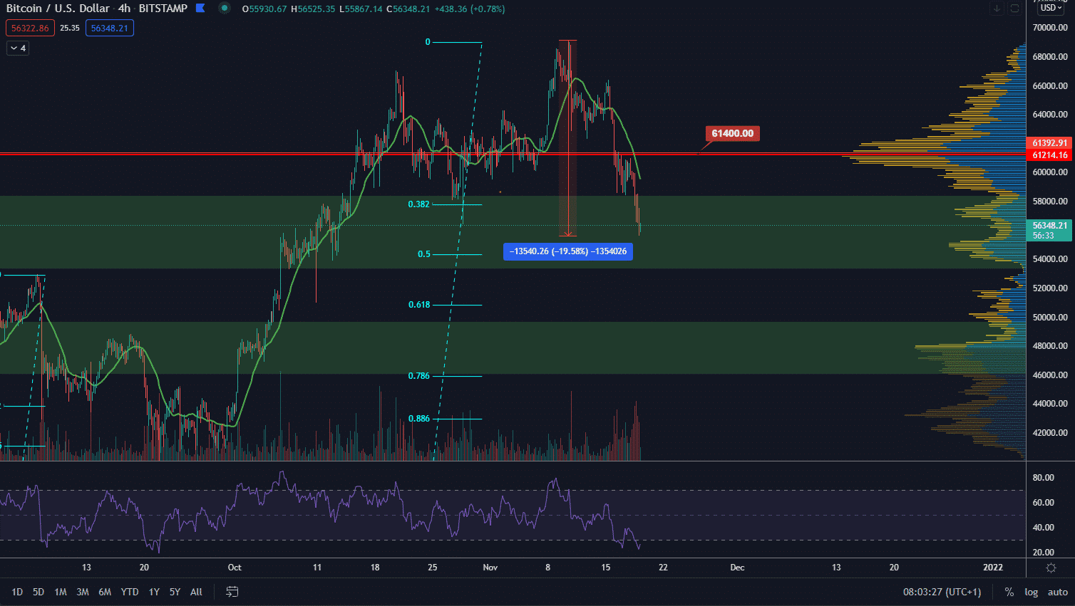 Spomínané minimum však môže byť iba súčasťou korekčnej štruktúry. To zatiaľ nemáme odkiaľ vedieť, no vieme, že ak nastane reverzia, tak býčí target, ktorý budeme sledovať, je na cca 61 400 $. Potom však pokojne korekcia môže pokračovať. Trhová cena je už teraz na supportej zóne, ktorá je definovaná od 58 000 $ do 54 000 $.