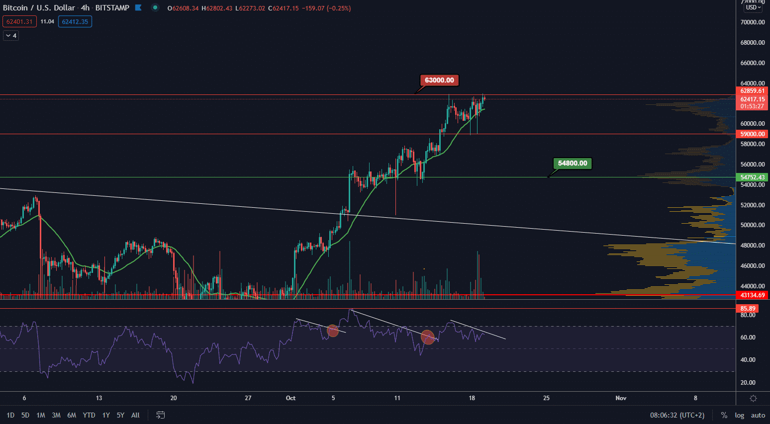 V prípade, že cena rezistenciu prekoná, tak pohyb sa odzrkadlí aj na RSI, ktorý prekoná znovu negatívnu divergenciu v neutrálnom pásme. Pri prekonaní 63 000 $ cene už nič nebude stáť v ceste, aby prekonala ATH. Samozrejme, cena ho môže prekonať aj krátkodobo a na pár dní môže ísť sideway a až následne bude trend pokračovať.