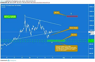 Bitcoin sa momentálne nachádza v korekčnej štruktúre. Sledujem, že cena po fake pohybu z triangla sa vrátila späť na 11 000 USD. Čakám v najbližších hodinách, že príde skôr pohyb hore na 12 000 USD. Keď si zanalyzujem BTC z pohľadu rastúceho trendu, ktorý začal ešte koncom minulého roka, sledujem, že sme aktuálne v korekčnej 4. vlne, v ktorej sa často nachádza triangel. V najbližších týždňoch čakám ešte jeden pohyb k 14 000 USD a vytvorenie patternu dvojitý vrchol.