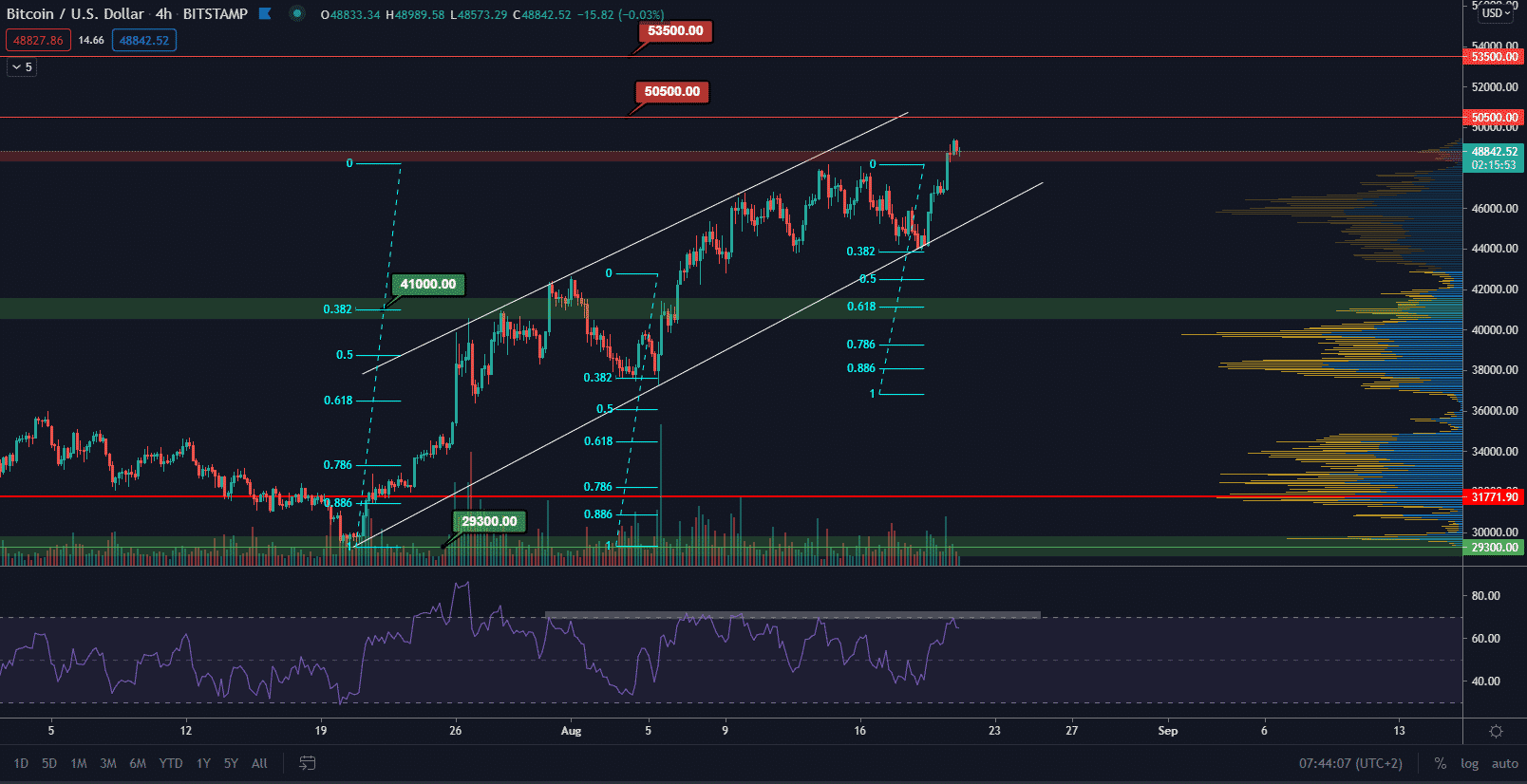 BTC sa momentálne stále nachádza v dlhodobom medveďom flagu, ktorý by pravdepodobne mal byť ukončený korekčným legom. Cena však zatiaľ rastie a posledným maximom sme otestovali rezistenciu na hladine 49 400 $. Je trh prehriaty, alebo bude trend stabilne pokračovať smerom nahor?