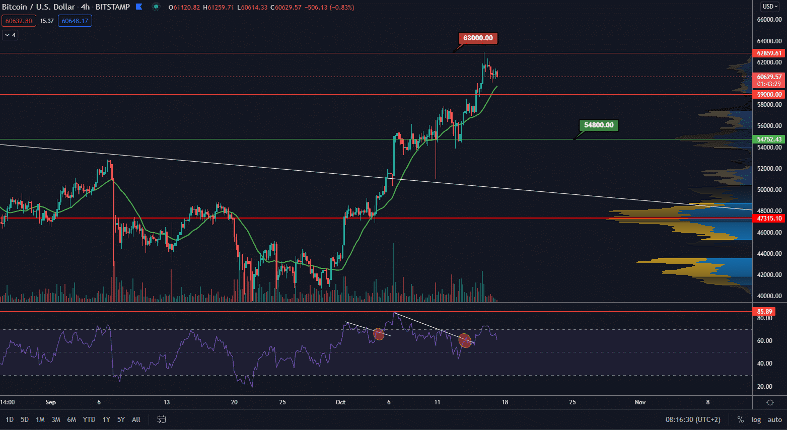 Najbližší support sa nachádza na hladine MA21 na hodnote 59 700 $ a následne je ďalší support na 54 800 $, čo vyplýva z predošlej krátkodobej sideway štruktúry. Z krátkodobého hľadiska tak cena musí trochu vychladnúť predtým ako zaútočíme na nové ATH. Následne vojde Bitcoin do zóny objavovania cien a do zóny bez rezistencií.