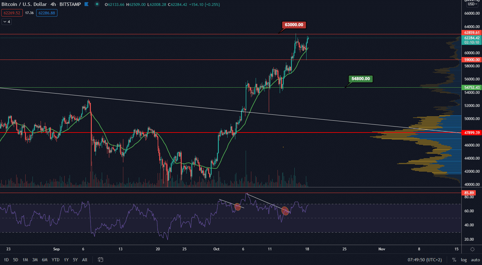 Ak by sa cene nepodarilo prekonať ATH okamžite, tak pravdepodobne by cena išla na pár dní do sideway pohybu, resp. miernej korekcie. Na konci dňa by však Bitcoin tak či onak ATH prekonal. Najbližšie supporty zatiaľ ostávajú na hodnotách 59 000 $ a 54 800 $.