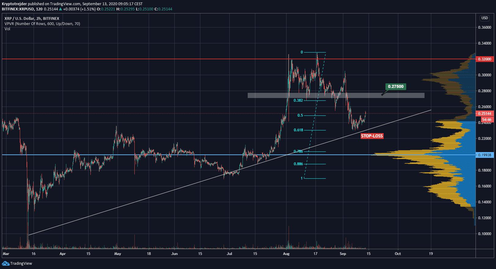 Po odrazení od hlavného supportu sa vytvoril dva-krát fakeový breakout. Korekcia sa zastavila na 50% fib retracemente no stále nemáme potvrdený koniec klesajúceho trendu. Bezpečný long je až nad 0,122$. Stopku nenastavujeme pod podporu ale až pod point of control, keďže je tesne pod supportom na hodnote 0,082$.