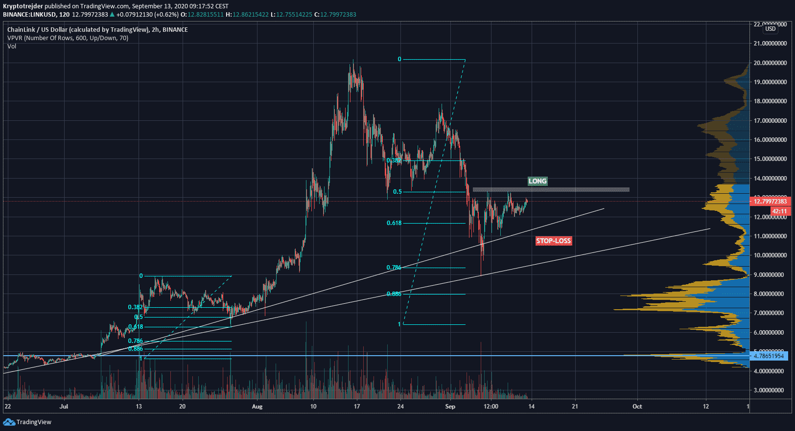 V prípade grafu Chainlink situácia nie je až taká zjavná. Máme zobrazené dva potenciálne supporty od ktorých sme sa odrazili. Jeden support berie do úvahy fake breaky a druhý nie. Síce krátkodobo cena rastie ale dlhodobo stále nedosahujeme vyššie maximá. Preto odporúčam ísť do lognu až pri prerazení dvojitého vrcholu na 13,30$.