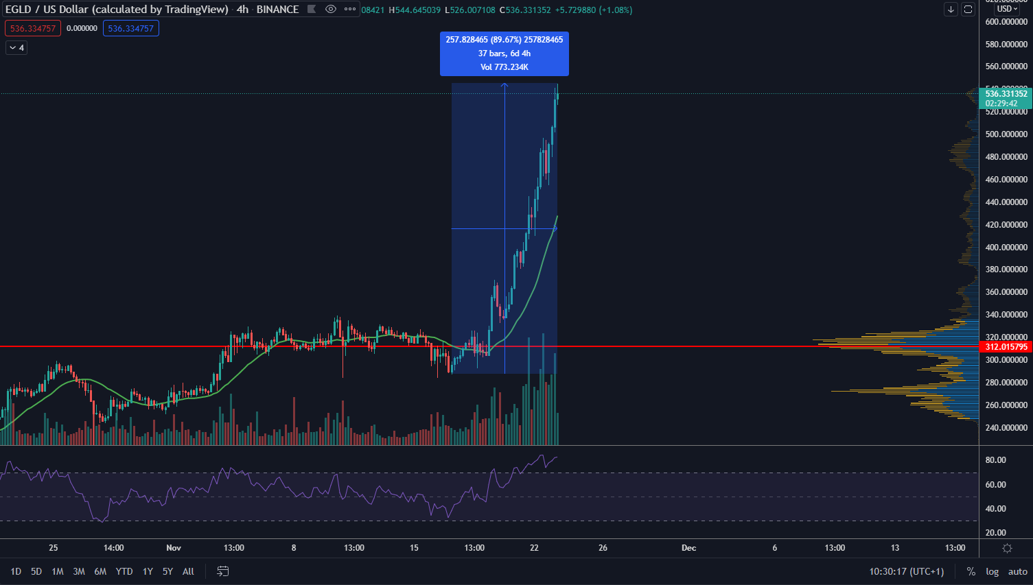 EGLD dosiahol za necelý týždeň zhodnotenie 90 %. Narozdiel od ostatných highcapových mincí tak dosahuje býčiu pumpu. Objemy taktiež prudko rastú a ide o býčí signál. Otázkou zostáva, či sme na vrchole rastúceho trendu, alebo bude ešte pokračovať. Trh sa totiž nachádza v prehriatej zóne.