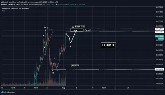 Ethereum po korekcii opäť pokračuje v raste. Osobne si myslím, že už čoskoro sa dostane na tohtoročné high. Na grafe sledujem tvorbu 3. vlny, ktorá sa vyznačuje vysokým volume a dlhými bullish, ale aj bearish sviečkami. Očakávam lokálny pokles späť na 0,031 BTC, kde by sa mohlo ETH otočiť a ďalej rásť. V súčasnosti je mi jedno, či ETH urobí ďalších 100 % alebo len vyskočí na tohtoročné high. Dôležitá je pre mňa ako Elliot wave tradera hladina 0,0326 BTC, kde chcem obchod zatvoriť. Je tu silná rezistencia a zároveň očakávané dokončenie lokálneho a aj dlhodobého bullish cyklu.