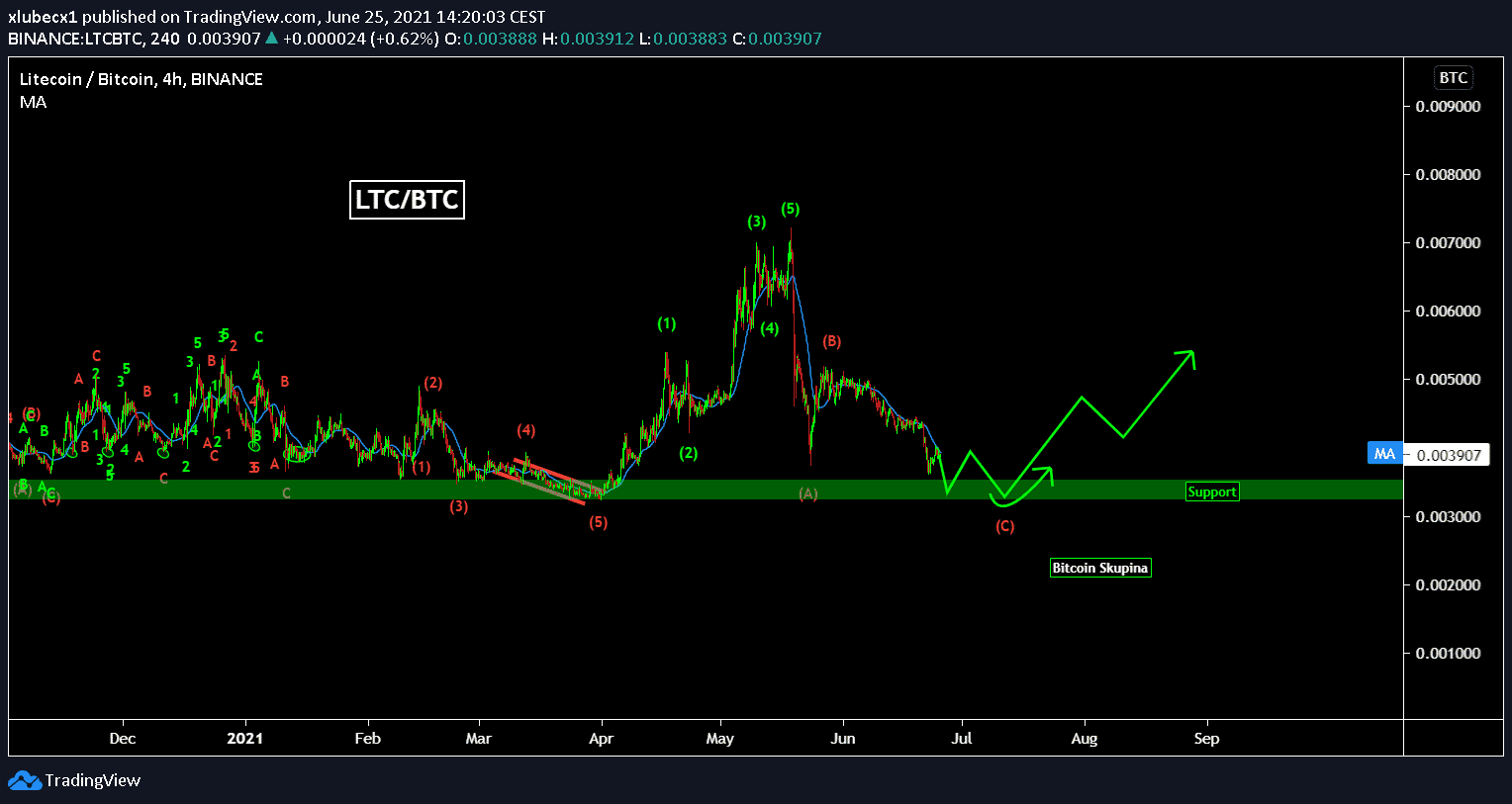 Na grafe LTC/BTC môžeme sledovať postupne zníženie volatility a zmenu do konsolidačnej štruktúry. Aktuálne čakáme na postupne otočenie trendu a zároveň odraz od aktuálne najsilnejšieho supportu na približne 0,003 BTC. Zároveň očakávame aj dokončenie ABC korekcie, s čím by malo prísť otočenie trendu.