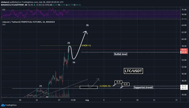 LTC zatiaľ pokračuje v priam až v ukážkovej bullish štruktúre. Po dlhom čakaní konečne začína rásť. Zatiaľ počítam s tvorbou lokálnej korekcie (4. vlna) a následným záverečným bullish pohybom, čím by sa dokončila celá štruktúra. Vstupovať do obchodu chcem cez limit order na 45 USD.