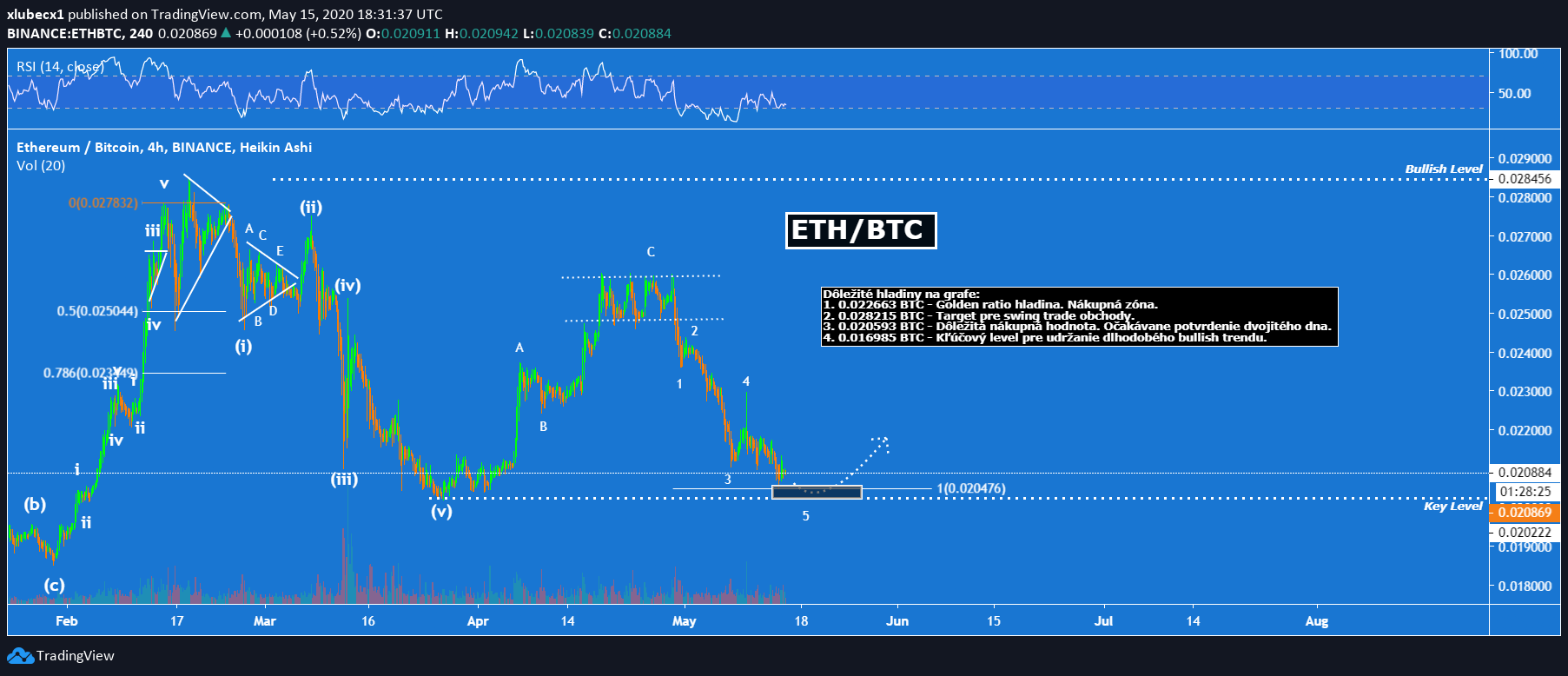 ETH sa blíži do dôležitej Fib. úrovne, konkrétne 1.0 extension vlny 1. V Elliot wave teórii je to veľmi dôležitá zóna, kde sa zvykne otáčať trend. Samozrejme, od tejto hodnoty sa môže, ale aj nemusí odraziť. Všetko teraz závisí od BTC. Po volatilnejšom období potrebuje vidieť aj trochu kľudnejšie obdobie, ktoré dá priestor altcoinom.