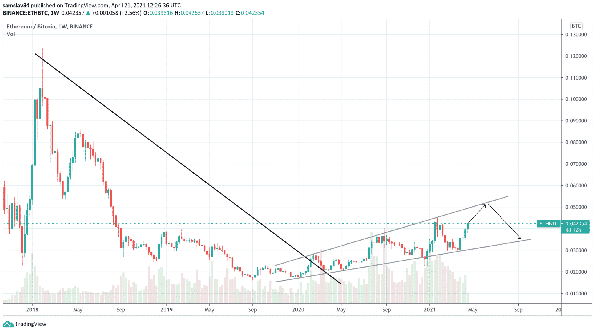 Možno ste to nepostrehli, no na začiatku apríla nastala dôležitá udalosť.Trh sa rozhodol rešpektovať dlhodobú stúpajúcu trendovú líniu, ktorá tvorí spodnú hranu formácie expanding vedge. To dalo obchodníkom impulz na nákup, a tak v čase, keď Bitcoin klesá, Ethereum drží svoju dolárovú cenu. Na grafe ETH/BTC tak vznikla ďalšia rastová vlna, ktorá môže zájsť naozaj vysoko: