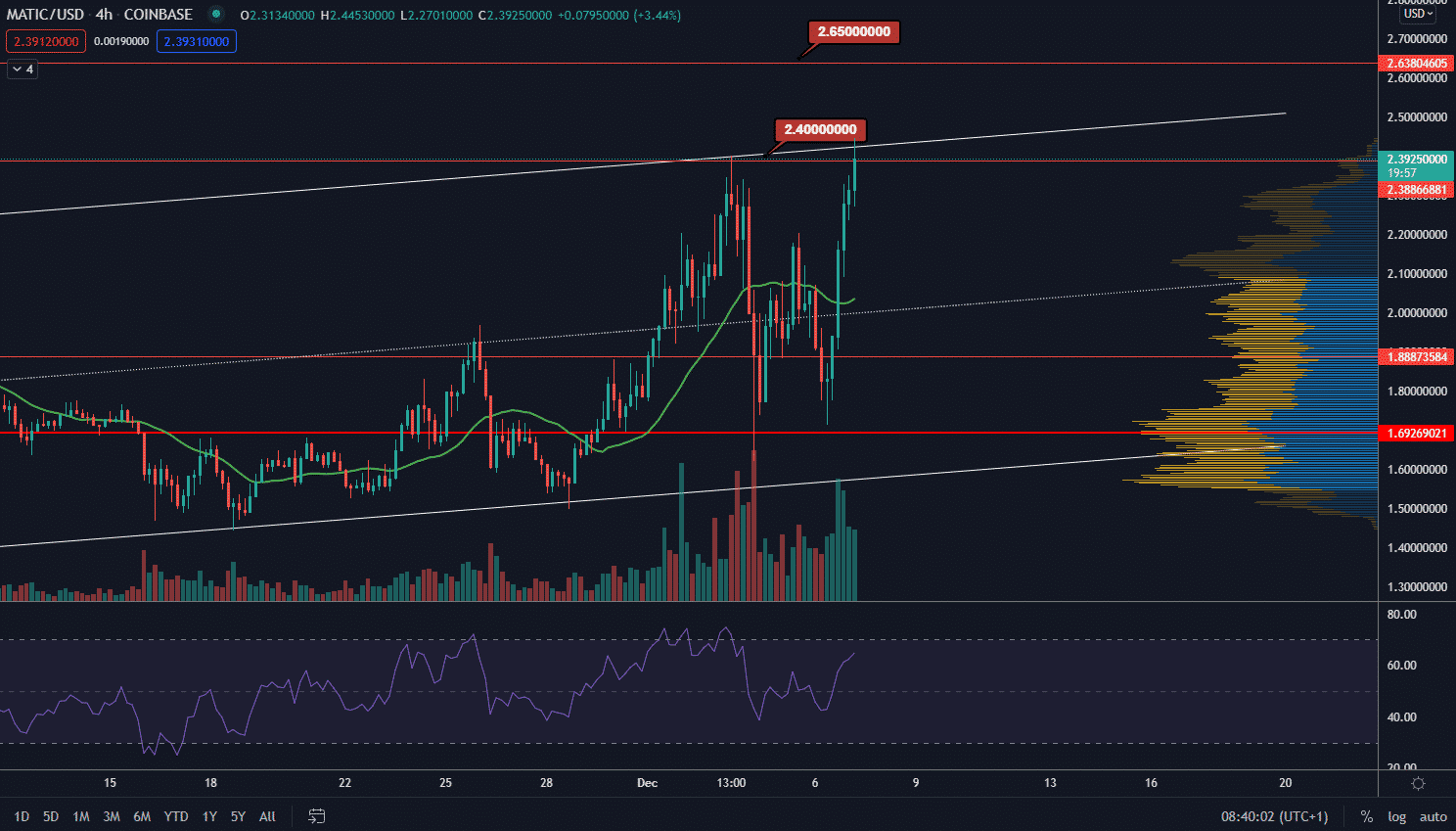 MATIC má jeden z najlepších výkonov za posledné obdobie, a to aj napriek korekcii na celom trhu. Trhová cena dokázala prekonať posledné maximum a dosiahla target 2,40 $. Ďalší target sledujeme na hladine 2,65 $. Cena pravdepodobne tak zaútočí na nové ATH. Ak sa definitívne dostane nad 2,40 $, tak prekoná aj rezistenciu dlhodobého flagu.