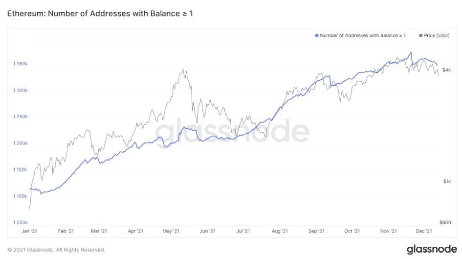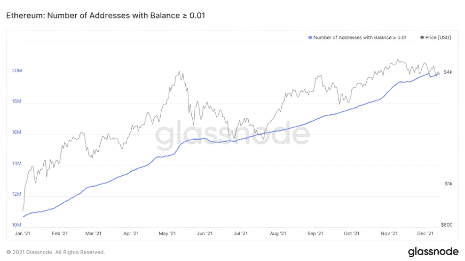 Výsledkom bolo, že počet ethereových adries s nenulovým zostatkom tiež dosiahol 12. decembra nový rekord, takmer 70 miliónov. Naopak, adresy s maximálne 1 Ethereom klesli spolu s cenami, čo naznačuje, že bol menší záujem o kúpu.