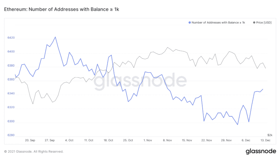 Napríklad údaje Glassnode ukazujú okrajové zotavenie nákupného záujmu v peňaženkách Etherea so zostatkami najmenej 1 000 ETH. Napriek tomu ich počet celkovo klesol z takmer 7 200 na menej ako 6 350 v roku 2021.