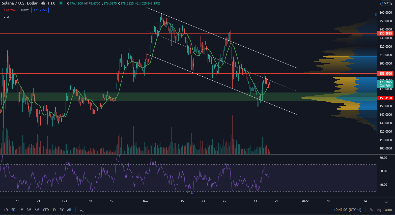 Solana sa odrazila od pásma supportu na point of control v hladine 160 $. Podstatné je, aby cena dokázala vytvoriť ďalšie minimum buď v tomto pásme, alebo vyššie. Až vtedy môžeme hovoriť o potenciálnom ukončení korekcie. Samozrejme, cena nemusí vytvoriť reverziu vyšším minimom a rezistenciu môže prekonať okamžite.