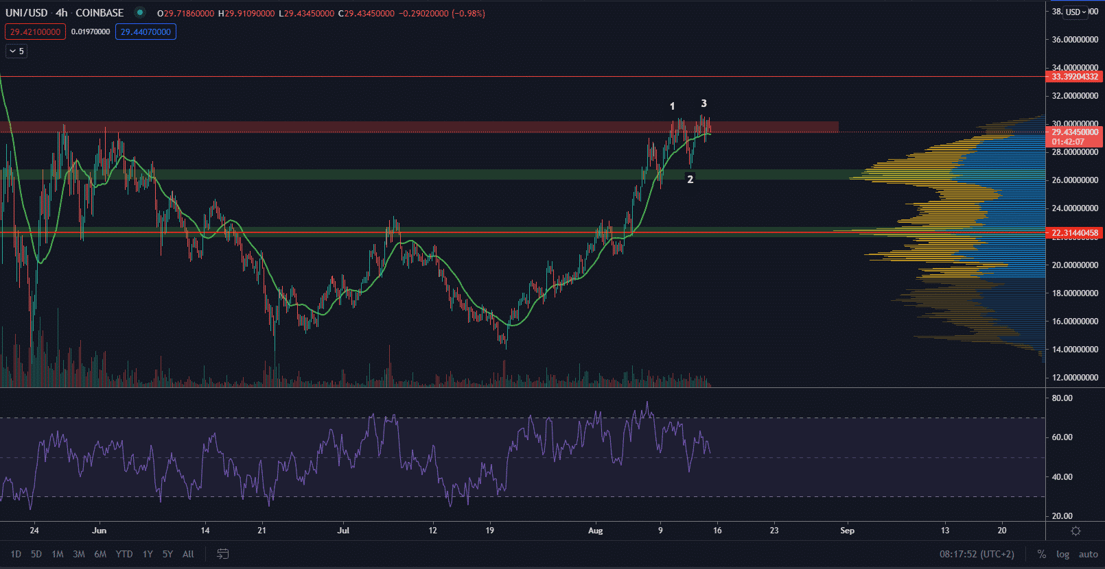 Uniswap pokračuje v rastúcom trende od posledného júlového týždňa. Posledné dve maximá však po prvýkrát v tomto raste zaznamenali zhruba rovnaké úrovne. Vznikol teda dvojitý vrchol na hladine cca 30,50 $. Po prekonaní tejto rezistencie je ďalší target na hladine cca 33,50 $.