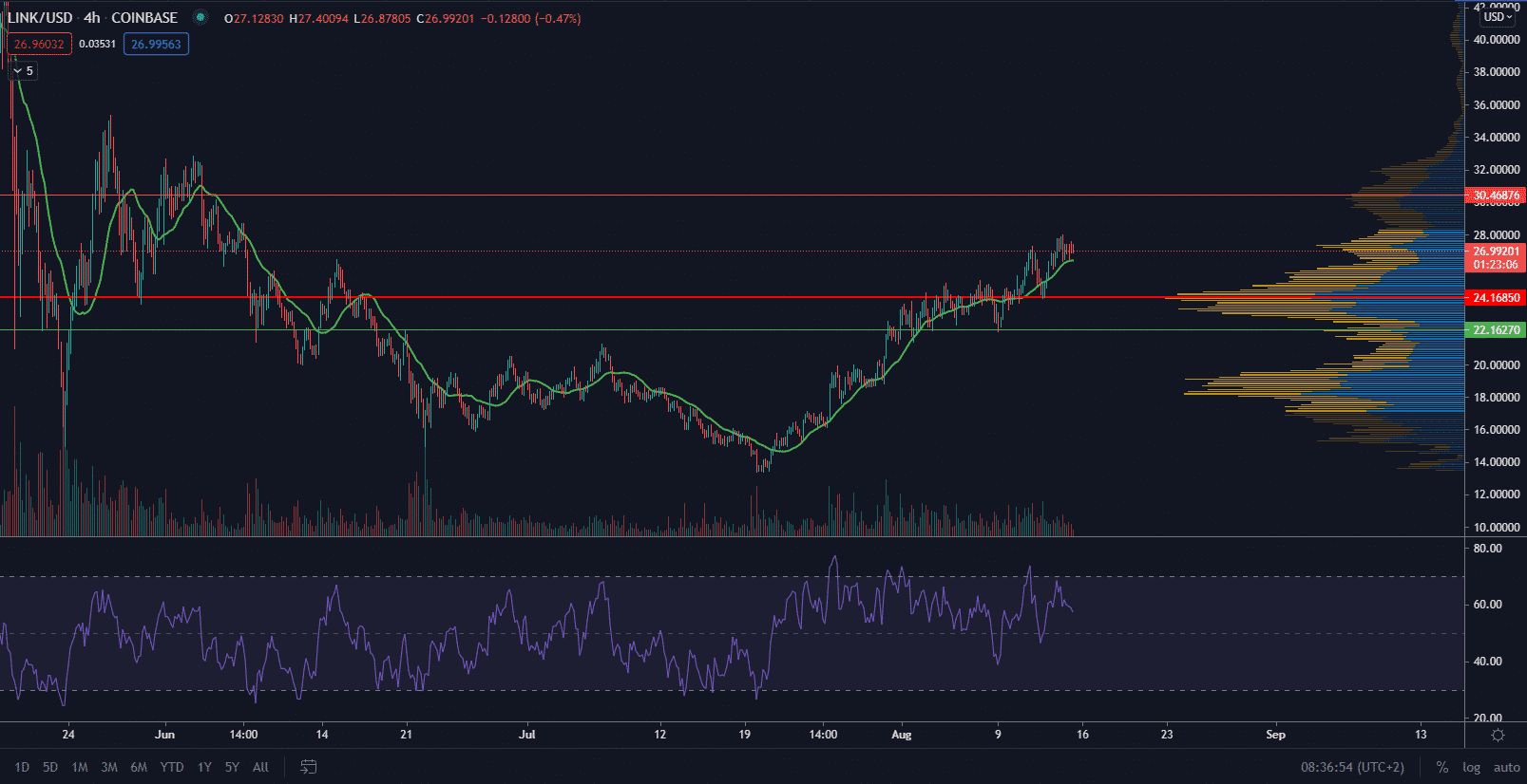 Chainlink taktiež pokračuje v rastúcom stabilnom trende. Na rozdiel od UNI nedosiahol dvojitý vrchol a maximá stále rastú. Trend sa však napriek tomu spomaľuje, čoho dôkazom sú aj znižujúce sa objemy v porovnaní so začiatkom trendu. Posledné dva supporty budeme sledovať na hladine point of control 24,16 $ a druhý na hladine 22,00 $.