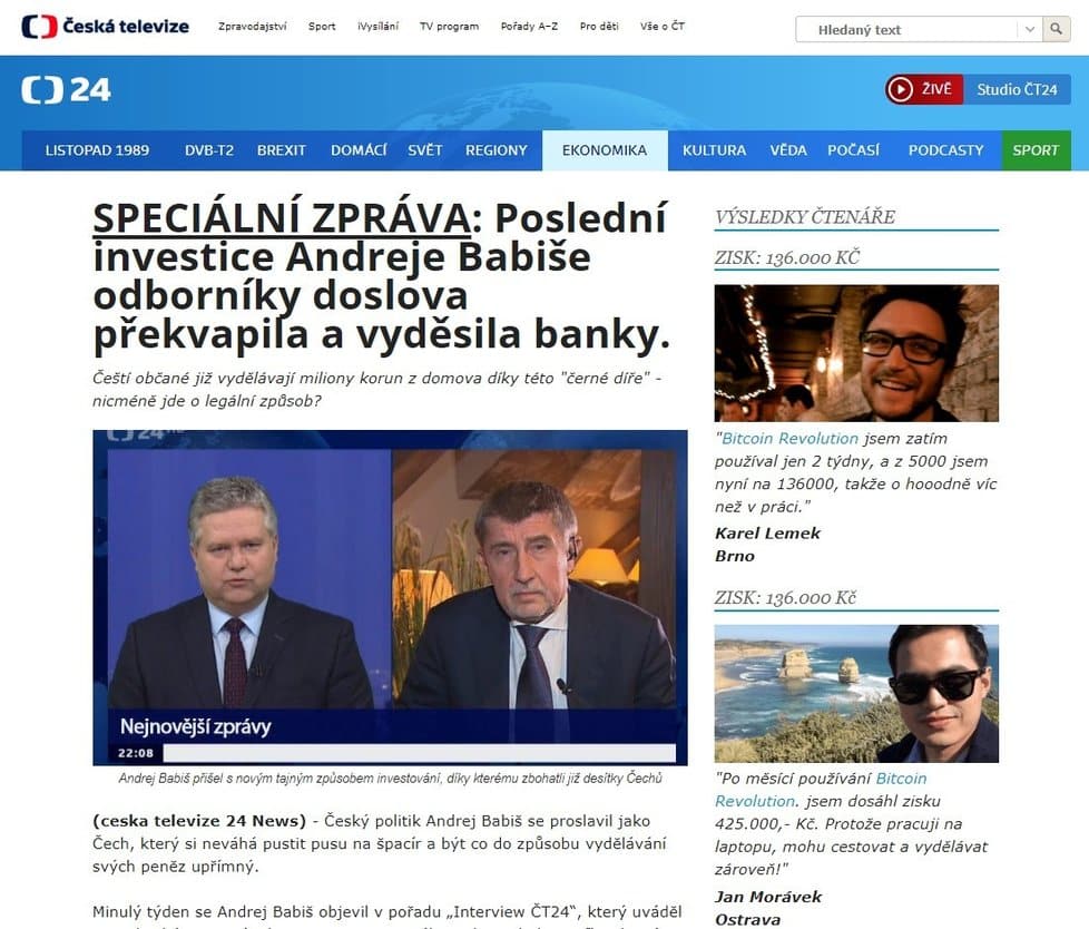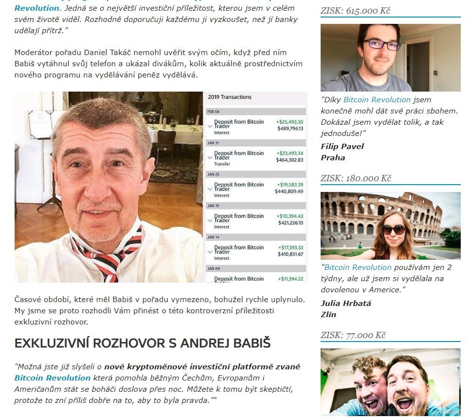 Tentokrát si podvodníci zneužili osobu českého premiéra Andreja Babiša. Ten sa vraj vo vymyslenom rozhovore v Českej Televízii pochválil zárobkami z tohto bota a „šokovanému moderátorovi ukázal, ako denne zarába desaťtisíce korún.“