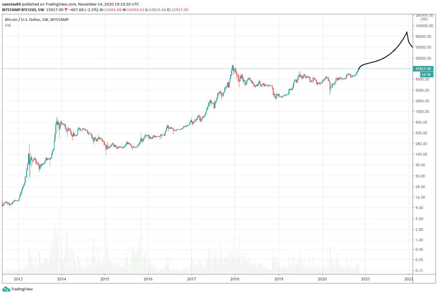 Momentálne sa obchoduje na najvyšších hodnotách od januára 2018 a mnohí ľudia sú presvedčení, že skôr či neskôr dosiahne nové historické maximum. Vyzerá to tak, že teória o štvorročných Bitcoinových cykloch je správna a aktuálne sme v tretej fáze. Začal nám býčí trend, ktorý by mal vo štvrtej fáze skončiť parabolickým rastom.