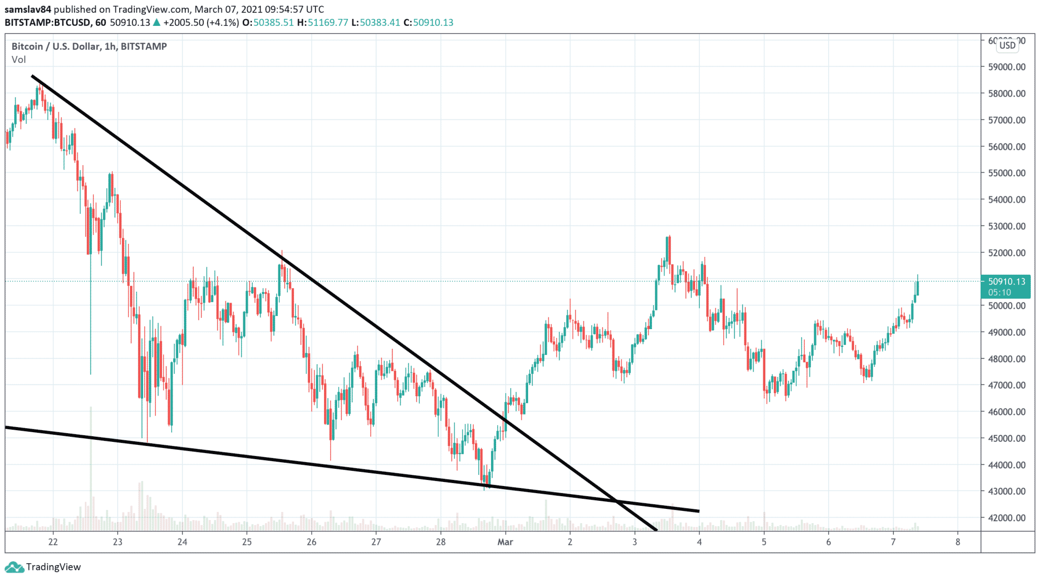 Tento víkend síce začal miernou korekciou, no všetko nakoniec dopadlo dobre. Vlastne, viac než dobre. Toto vyzerá naozaj sľubne. Ak sa niečo kardinálne nepos****. Ehm.. ak sa niečo nepokazí, Bitcoin môže v priebehu budúceho týždňa veľmi ľahko dosiahnuť nové historické maximum. Včera opäť spravil vyššie minium a dnes dokonca došlo k prekonaniu hladiny 50 000 dolárov. Už nám chýba iba vyššie lokálne maximum, ako to, z 3.3.