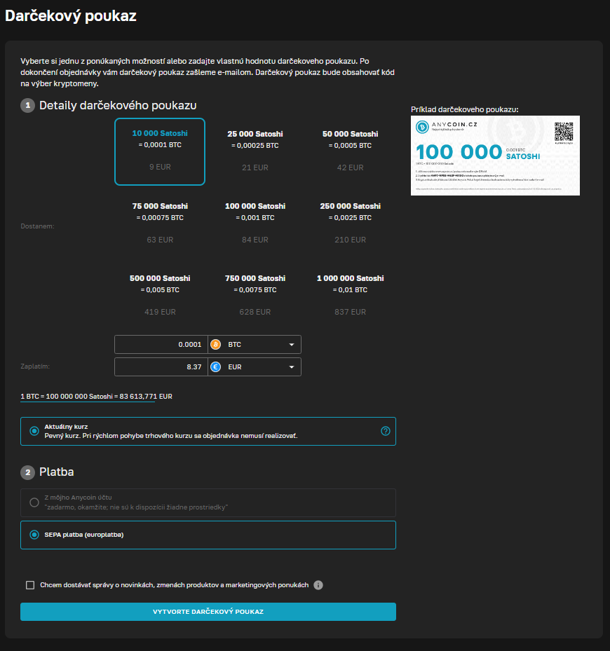 V prípade, že chcete niekoho obdarovať, máte k dispozícii darčekové poukazy od spoločnosti Anycoin. Buď si vyberiete jednu z možností, ktorú vám ponúka platforma, alebo si zvolíte svoju vlastnú hodnotu. Po zakúpení získate poukaz cez e-mail. Obsahom poukazu je kód na výber kryptomeny. Kód je možné uplatniť priamo na stránkach Anycoinu.