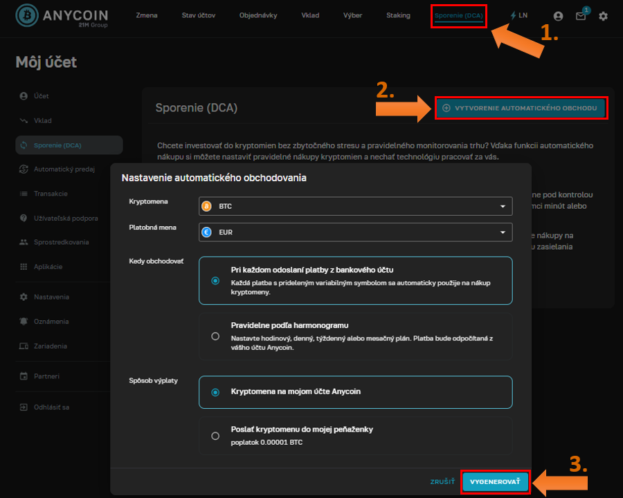 Postup, ako začať pravidelné DCA investovanie na Anycoine, vidíte na obrázku nižšie. Stačí kliknúť na políčko Sporenie DCA -> Vytvorenie automatického obchodu -> Vygenerovať.