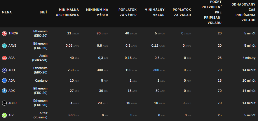 Nasledujúca tabuľka zobrazuje niekoľko príkladov poplatkov za vklad a výber pre vybrané kryptomeny. Máte tu taktiež prehľad o minimálnej objednávke, minimálnom výbere a vklade. Kompletný zoznam nájdete tu.
