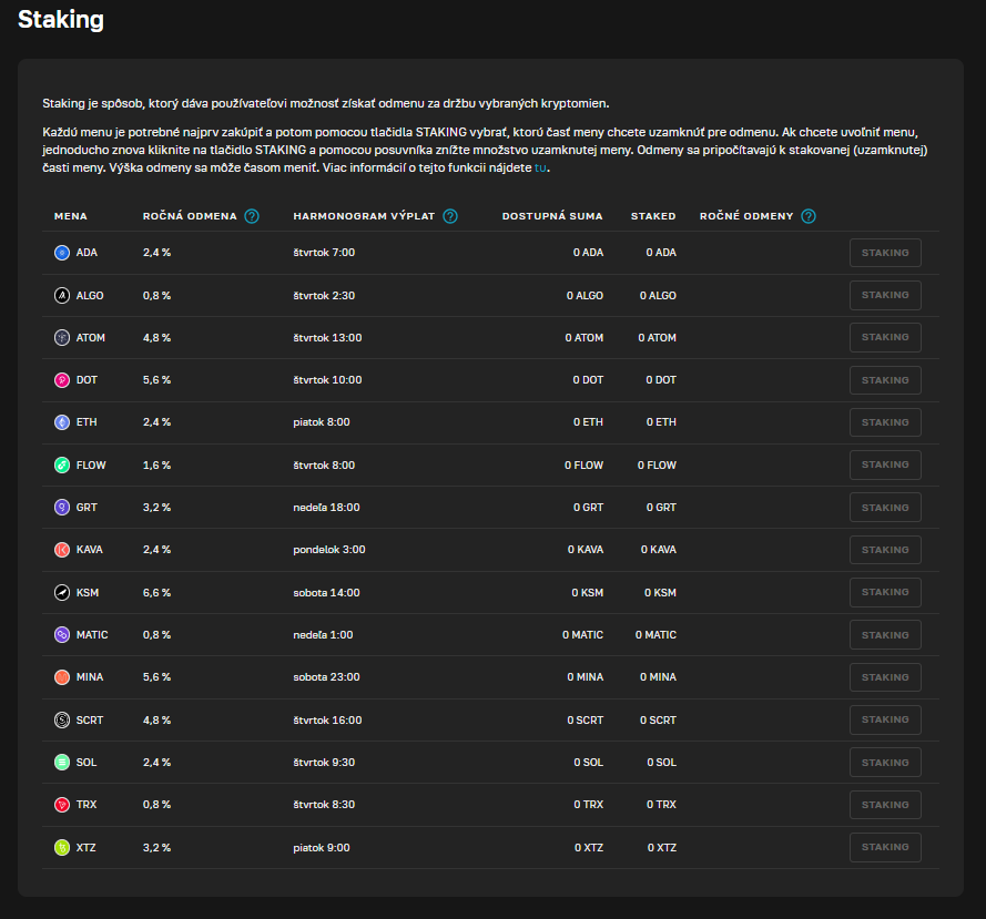 - Ročné odmeny – odhadovaná suma na základe aktuálneho stredného kurzu, ak je mena v stakingu 1 rok. Táto hodnota je len odhadom a závisí od aktuálneho trhového kurzu.