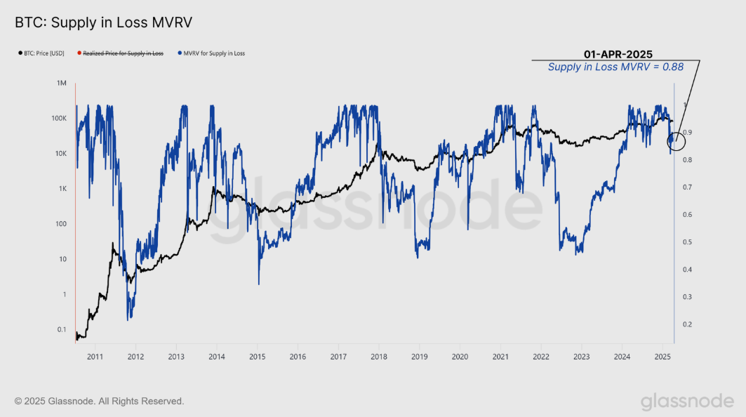 Ďalšou metrikou je Supply in Loss Realized Price, ktorá slúži na porovnanie toho, ako hlboko sú priemerní investori v strate. Túto metriku môžeme následne použiť na porovnanie s predchádzajúcimi cyklami a ako vstup na identifikáciu hĺbky investičného stresu a prípadných skorých signálov oživenia.