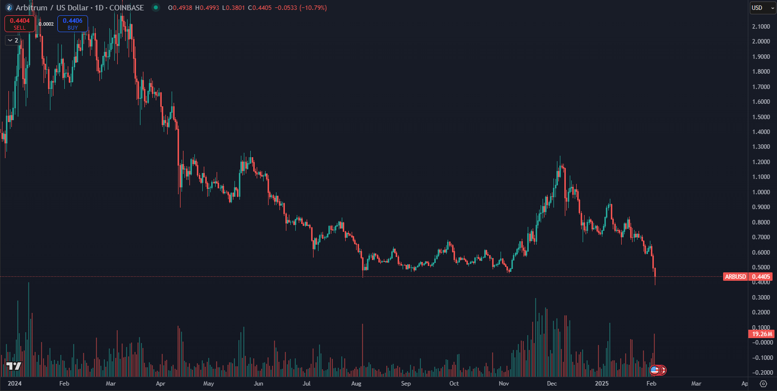ARB prelomil niekoľko podporných trendov a 50-dňový kĺzavý priemer naznačuje klesajúci trend. V čase písania sa Arbitrum (ARB) obchoduje za 0,44 dolárov s 24-hodinovým obchodným objemom 200 miliónov dolárov, čo predstavuje pokles o 25 %. Analytici predpovedajú, že ARB by mohol klesnúť o ďalších 25 %, čo vedie investorov k presunu k aktívam s vyšším rastom, ako je SHIBI.