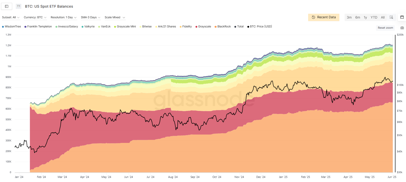 Ako jeden z hlavných dôvodov rastu je dopyt po spotových ETF, ukazujú údaje z Glassnode. Tie aktuálne spravujú viac ako 120 miliárd dolárov, čo svedčí o tom, že Bitcoin sa už považuje za etablované aktívum, nie len špekulatívny nástroj.
