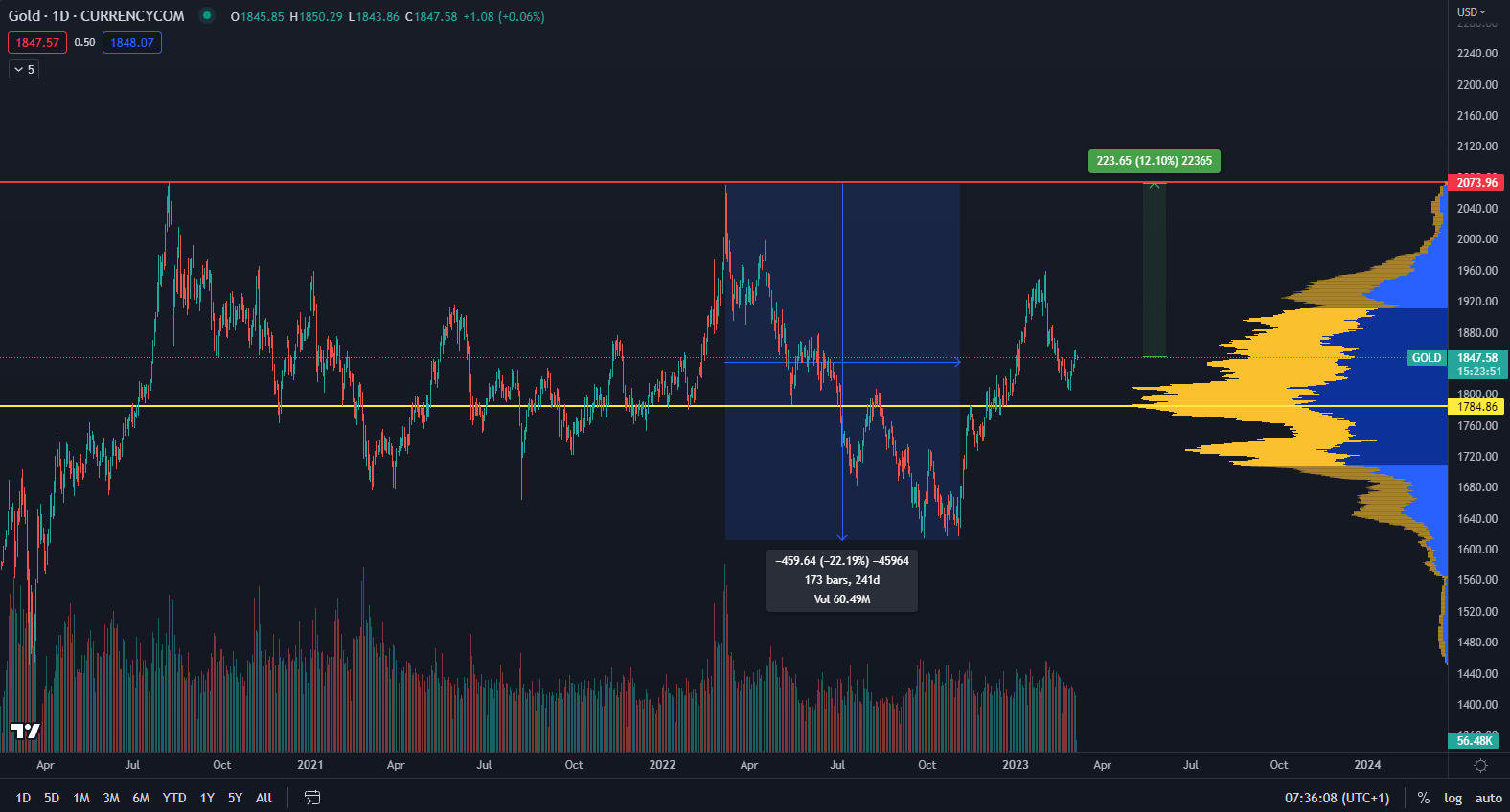 Napriek tomu sme svedkami dlhodobej bočnej štruktúry, pričom hlavná rezistencia zostáva zachovaná na úrovni historického maxima 2 073 dolárov. Trhovej cene chýba iba 12 % na to, aby sa dostala na túto hladinu.