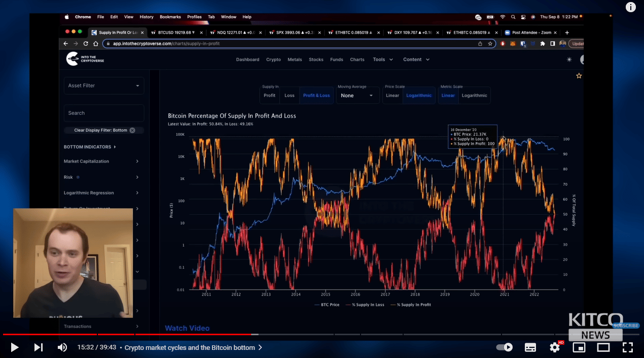 Cowen na analýzu dlhodobého dna korekcie využil on-chain metriku ziskov a strát, ktorá ukazuje, aké percento mincí je aktuálne v zisku, resp. v strate. Na tejto metrike demonštroval, že aktuálna cena čoskoro dosiahne dno.