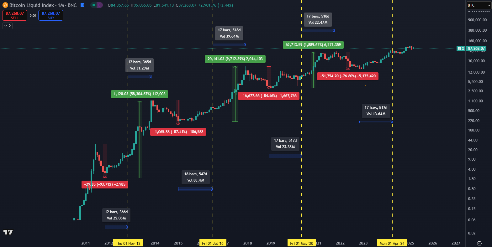 Podľa historických vzorov tento typ pohybu v minulosti viedol k ziskom 50 % – 100 % a očakáva sa, že Bitcoin bude v nasledujúcich týždňoch pokračovať v rastúcom trende. Momentálne sa Bitcoin pohybuje okolo 87 100 dolárov, pričom ďalšia dôležitá zóna odporu je medzi 150 000 a 165 000 dolárov.