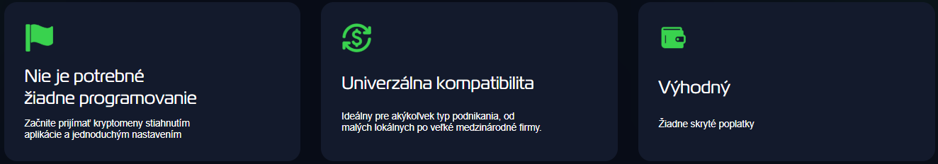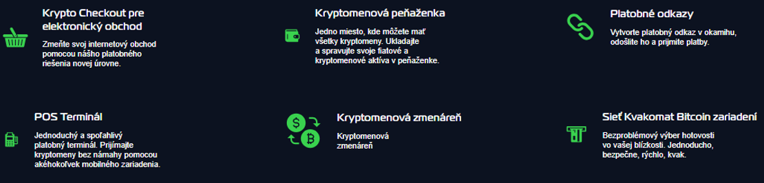 - Krypto Checkout: riešenie, ktoré umožňuje e-shopom prijímať platby v kryptomenách priamo na svojich stránkach. Užívatelia môžu jednoducho zaplatiť pomocou rôznych kryptomien, čo zjednodušuje proces a rozširuje platobné možnosti pre podniky.