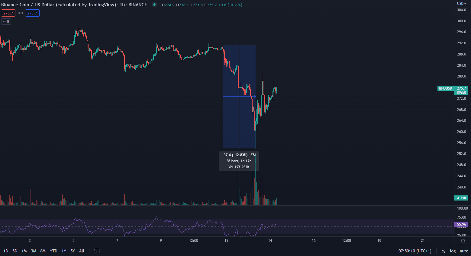 Ako vidíme na grafe nižšie, cena BNB zaznamenala vysoko volatilný pád v priebehu iba niekoľkých hodín. Zároveň ale token otestoval kľúčový support, ktorý sa nachádza na zóne okolo 250 dolárov. Od tohto pádu cena začala opäť rásť a zdá sa, že krátkodobá panika je zažehnaná.