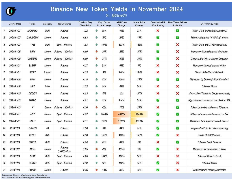November priniesol rekordné nárasty pre väčšinu novo listovaných tokenov na Binance. Z podrobných údajov a správy od PANews vyplýva, že viac ako 60 % všetkých nových tokenov dosiahlo svoje historické maximá (ATH) krátko po ich uvedení na najväčšiu kryptoburzu sveta, čo predstavuje bezprecedentný úspech v histórii kryptomenových listingov.