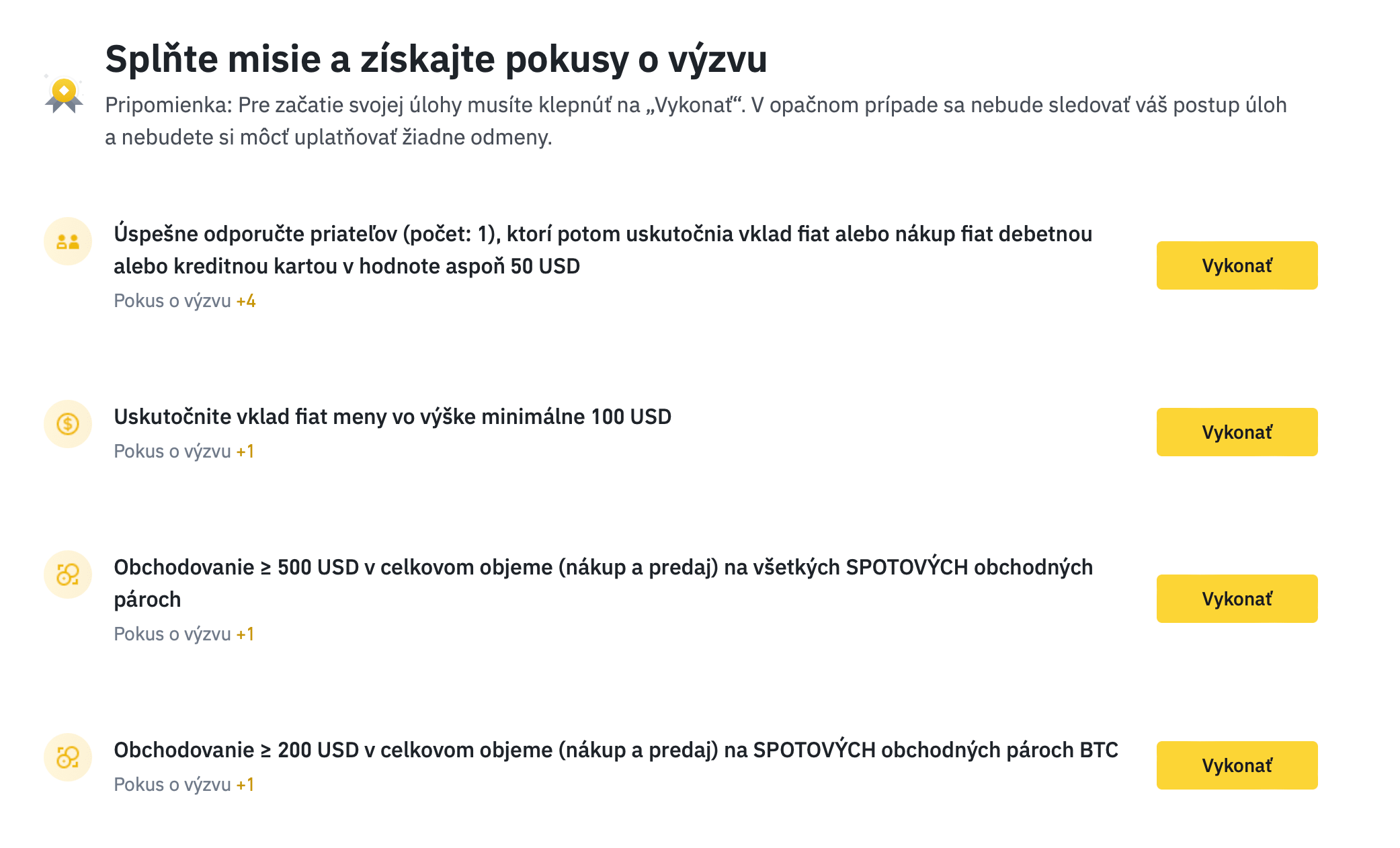 - Úspešne odporučte jednému priateľovi, aby si založil účet Binance, dokončil KYC a vložil aspoň ekvivalent 50 USDT cez Fiat Deposit alebo cez funkciu „Buy Crypto“, aby ste odomkli štyri pokusy o aktivitu.