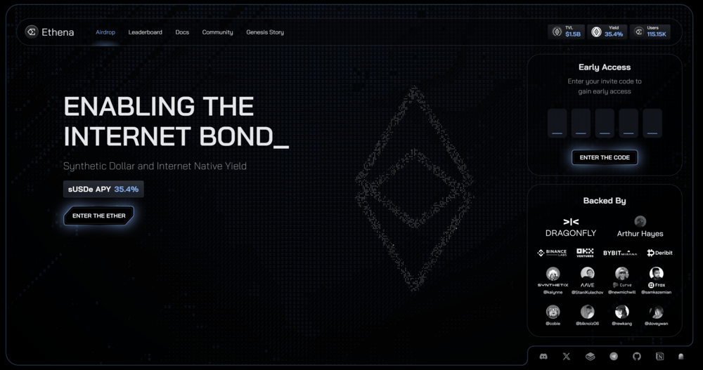 Ethena je protokol syntetického dolára postavený na Ethereum, ktorý poskytne krypto-natívne riešenie pre peniaze, ktoré sa nespoliehajú na tradičnú infraštruktúru bankového systému, popri globálne prístupnom nástroji sporenia denominovanom v dolároch – „internetový dlhopis”. Syntetický dolár USDe ponúkne prvé cenzúrovo odolné, škálovateľné a stabilné krypto-natívne riešenie pre peniaze dosiahnuté delta-zaistením vloženého kolaterálu Ethereum. USDe bude transparentne podporovaný a bude môcť voľne skladať v celom DeFi.