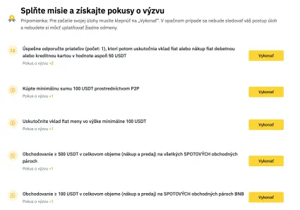 Následne si zvoľte misiu a kliknite na „Vykonať“. Počas aktivity je možné zbierať pokusy o odmeny plnením rôznych úloh, ako napríklad pozvaním priateľa, ktorý si na Binance vytvorí účet, absolvuje KYC proces a vloží minimálne 50 USDT.