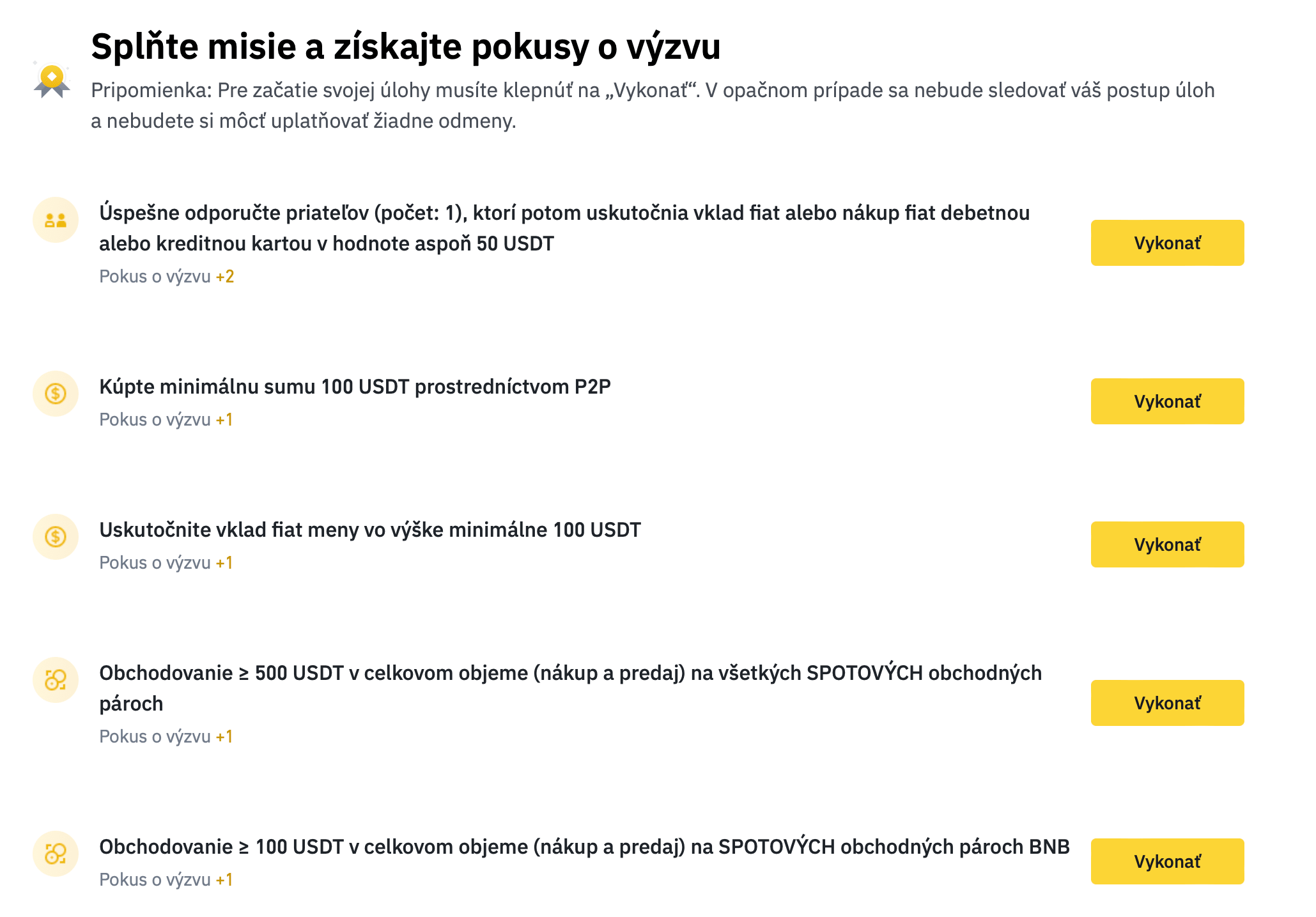 Následne si zvoľte misiu a kliknite na „Vykonať“. Počas aktivity je možné zbierať pokusy o odmeny plnením rôznych úloh, ako napríklad pozvaním priateľa, ktorý si na Binance vytvorí účet, absolvuje KYC proces a vloží minimálne 50 USDT.