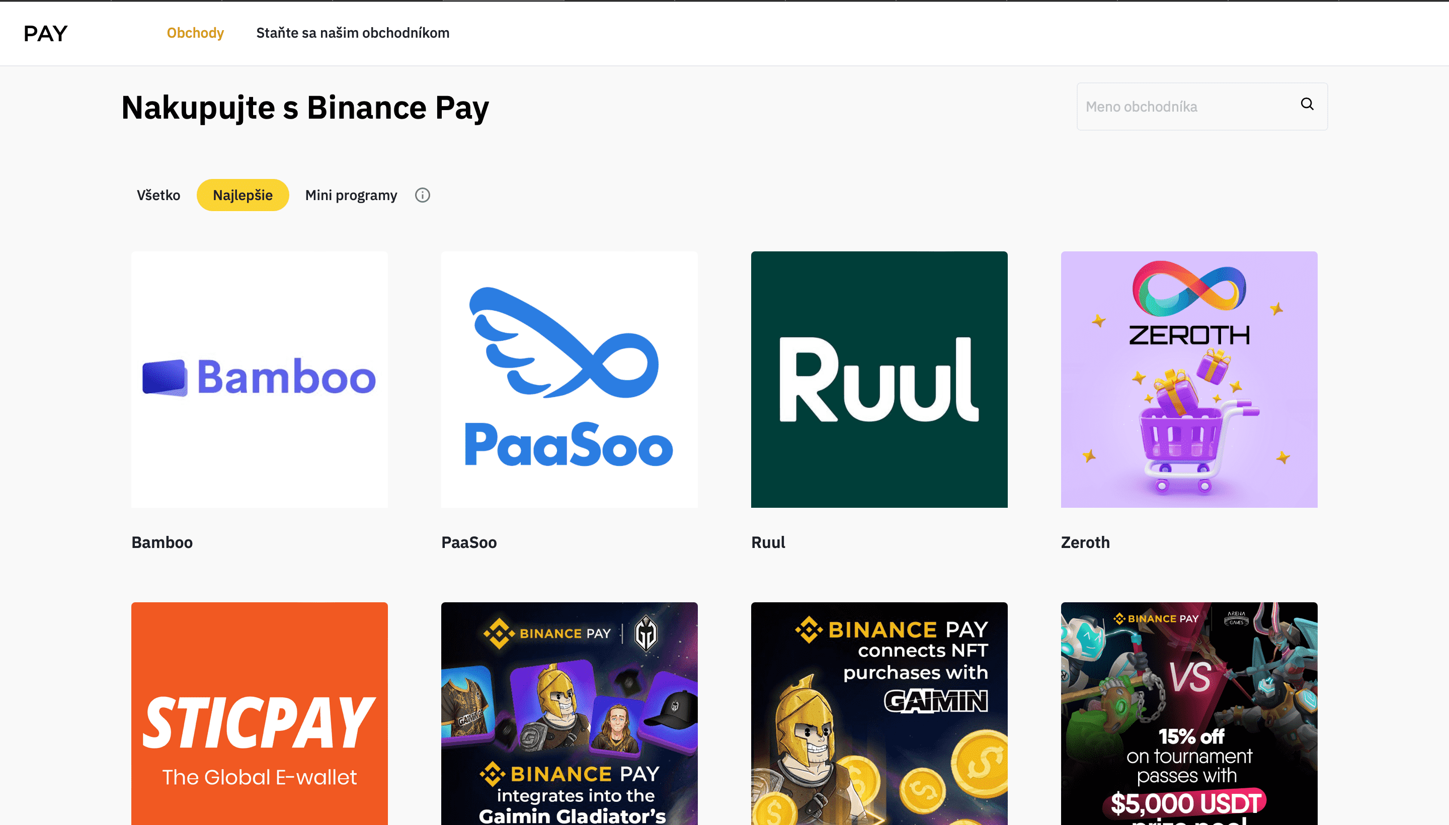 Tretia akcia poteší všetkých, ktorí radi nakupujú so zľavou. V rámci akcie Binance Pay Hot Deals si budú môcť všetci používatelia Binance Pay vychutnať exkluzívne zľavy až do výšky 50 % na darčekové karty, dobíjanie hier a ďalšie produkty u vybraných partnerských obchodníkov na Binance Marketplace, medzi ktorých patria Bamboo, Byte Topup, CryptoMate, Tokenstore a Uquid.