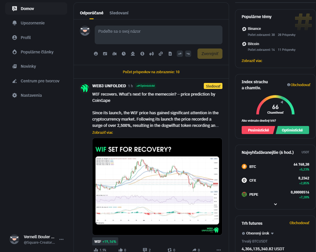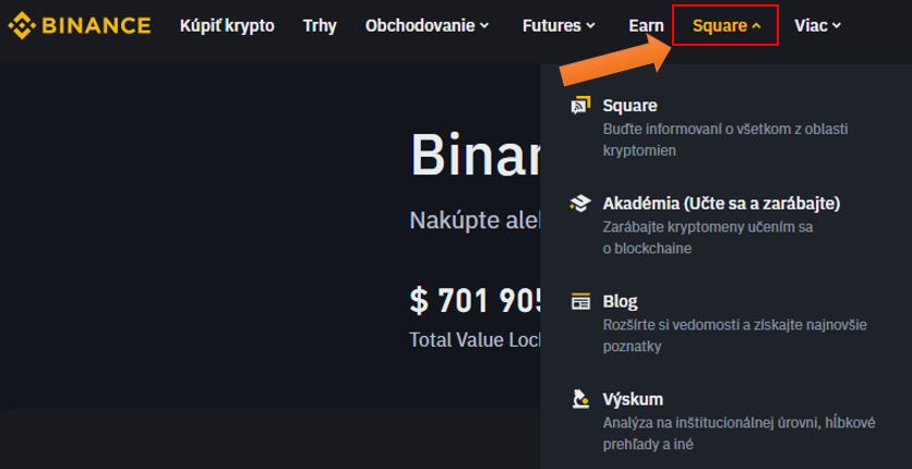 V prvej časti s názvom Square sa môžete stať súčasťou najväčšej kryptomenovej komunity na svete. Hneď po tom sa vám zobrazí rozhranie, kde môžete sledovať najnovšie správy, alebo dokonca pridávať vlastné príspevky. Dá sa povedať, že je to niečo ako sociálna sieť pre fanúšikov kryptomien priamo integrovaná v najväčšej kryptomenovej burze Binance.
