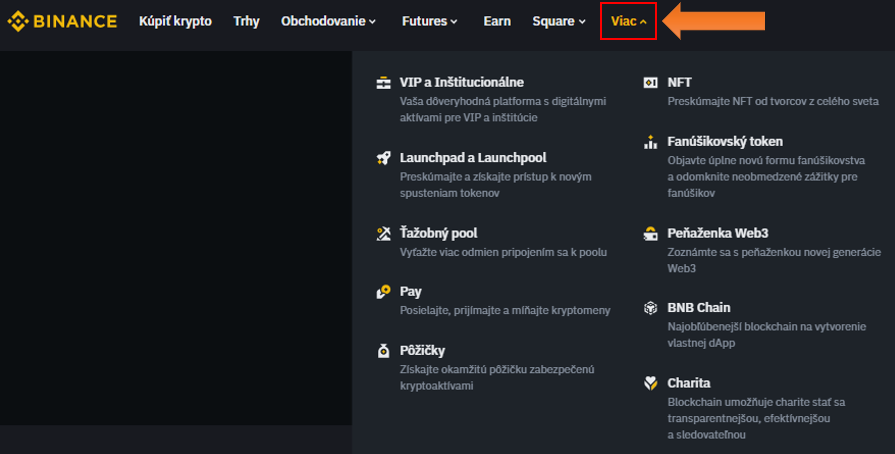 V tejto kapitole v skratke zhrnieme všetky ďalšie produkty, ktoré nájdete na platforme Binance. Ich zoznam nájdete v hlavnom menu pod sekciou Viac. Následne si predstavíme tieto produkty: