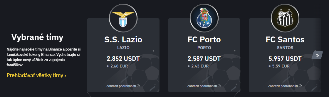 Fanúšikovské tokeny od Binance sú typom digitálnej meny, ktorá podporuje zážitky fanúšikov a prepája značky a tímy s fanúšikmi po celom svete. Spoločnosť Binance spolupracuje s tímami, ktoré prostredníctvom platformy Launchpad Binance spúšťajú tokeny, vďaka ktorým môžu svojim fanúšikom ponúkať plnohodnotné zážitky spojené s ich značkou.